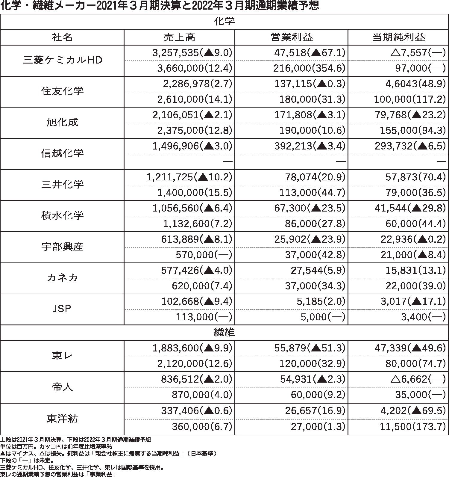 上場している主要な化学・繊維メーカー12社の2021年3月期の業績は、繊維メーカー3社、化学メーカー6社が減収減益となり、業績が悪化した。新型コロナウイルス感染拡大に伴う期前半の自動車減産の影響が大きく足を引っ張った。「自動車関連事業は明...