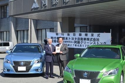 【熊本】熊本トヨタ(與縄義昭社長)は17日、阿蘇市役所で「阿蘇グリーンストック寄付金贈呈式」を行った。同社が2014年度に販売したプリウスなどハイブリッド車(HV)1台につき千円を積み立てた163万8千円を寄付したもので、昨年に引き続き阿...