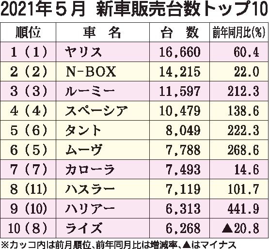 5月の車名別新車販売台数は、登録車と軽自動車の総合ランキングでトヨタ自動車「ヤリス」が9カ月連続でトップとなった。2位がホンダ「N―BOX(エヌボックス)」で、1~4位は前月と比べて変動はない。トヨタの全車種併売を追い風に販売台数を伸ばしていた「アルファード」が、昨年7月以来10カ月ぶりにトップ10入りを逃した。
