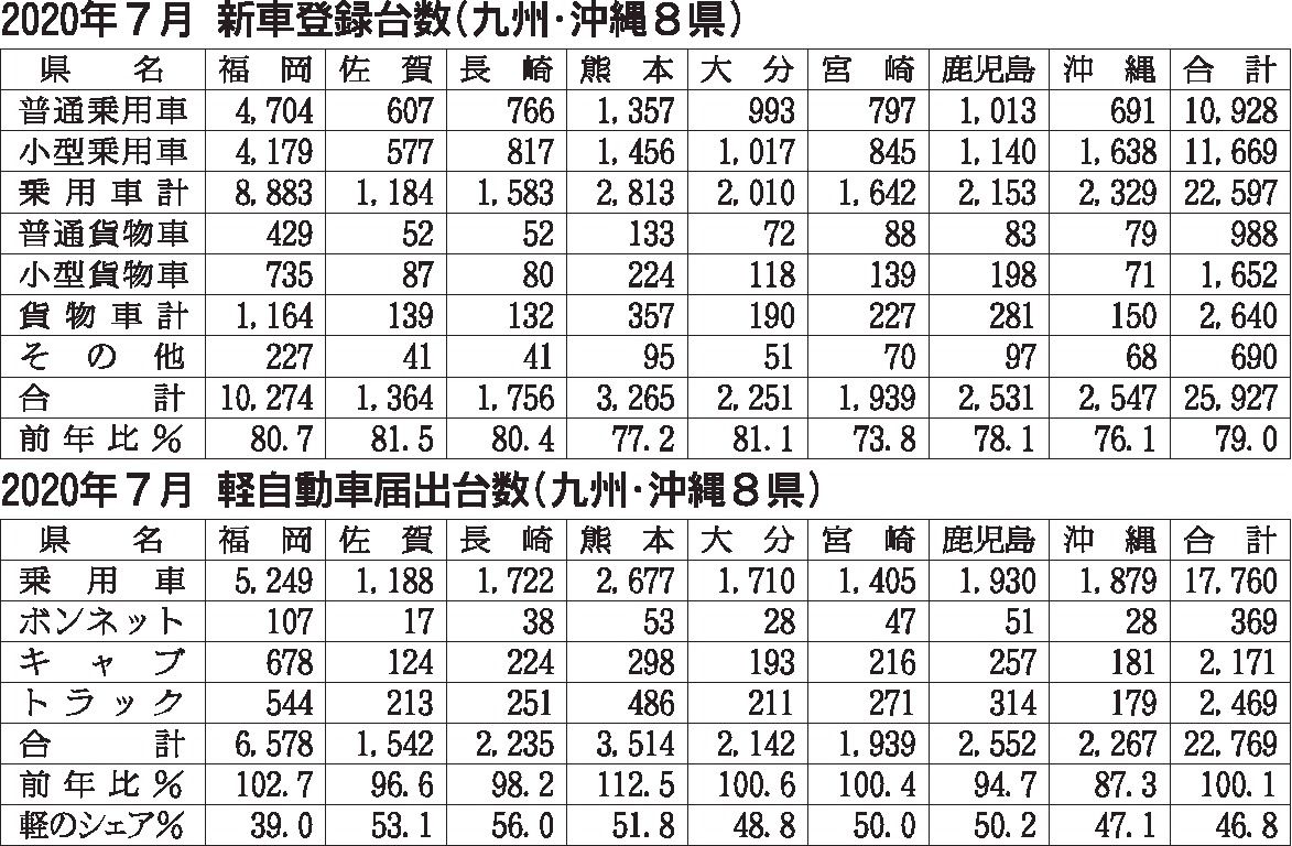 九州・沖縄地区の7月の新車販売台数は前年同期比12・4%減の4万8696台となり、2019年の10月から10カ月連続で前年実績を下回る厳しい結果となった。ただ、軽自動車は微増ながら10カ月ぶりに前年実績を上回り、登録車も減少幅が縮小するな...