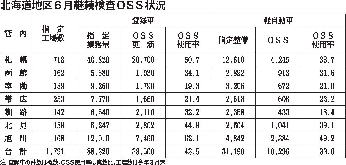 着実に進む北海道地区の継続検査ワンストップサービス(OSS)―。6月のOSS使用率は登録車43・5%、軽自動車33・0%となった。1月時点と比べ、全国よりアップ率が高い。ペーパレスの電子申請は業務改善のほか、いわゆる「三密」を避けることに...