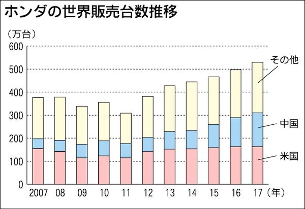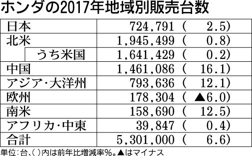 ホンダの2017年世界販売台数は前年比6・6%増の530万1千台となり、暦年で初めて500万台を超えた。米国が前年比微増ながら過去最高を更新したほか、中国が同16・1%増の146万1千台と過去最高を更新し、全体をけん引した。欧州は前年を下...