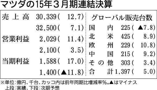 マツダは24日、2015年3月期の連結業績と16年3月期の見通しを発表した。15年3月期では過去最高益を記録、16年3月期は営業利益で前年同期比3・5%増の2100億円と3年連続の過去最高更新を目指す。15年度は新型「ロードスター」を当初...