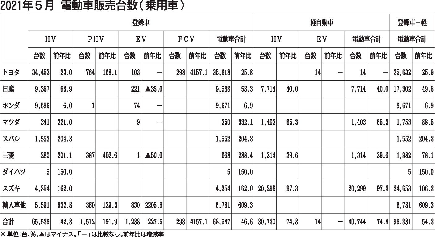 登録車と軽自動車を合わせた5月のハイブリッド車(HV)などの電動車販売台数(乗用車)は、前年同月比54・3%増の9万9331台となり、8カ月連続のプラスとなった。乗用車に占める電動車比率は、前年同月から1・1㌽上昇し38・0%だった。登録...