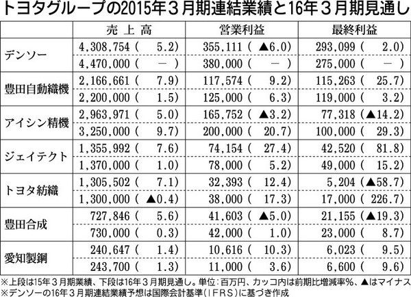トヨタ系大手部品メーカーが28日発表した2015年3月期連結業績は、まだら模様となった。7社中4社が営業増益を果たした一方、3社が営業減益を喫した。全社が営業増益だった14年3月期から一転したのは日本やアジアの減速が長引いているほか、将来...