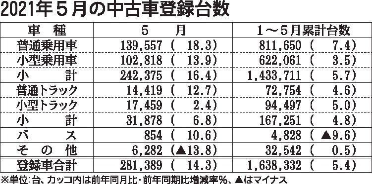 日本自動車販売協会連合会(自販連、加藤和夫会長)が10日に発表した2021年5月の中古車登録台数は、前年同月比14・3%増の28万1389台だった。前年を上回るのは4カ月連続。前年が新型コロナウイルス感染拡大の影響で大幅減だった反動と、中...