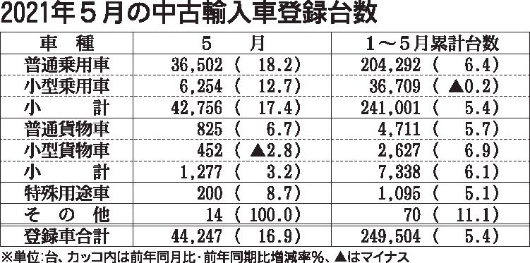 日本自動車輸入組合(JAIA、ティル・シェア理事長)が10日に発表した2021年5月の中古輸入車登録台数は、前年同月比16・9%増の4万4247台となり、3カ月連続で前年を上回った。前年の新型コロナウイルス感染拡大による落ち込みの反動や、...