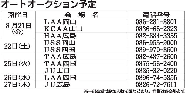 〈オートオークション予定〉中四国地区 2020/8/21~27