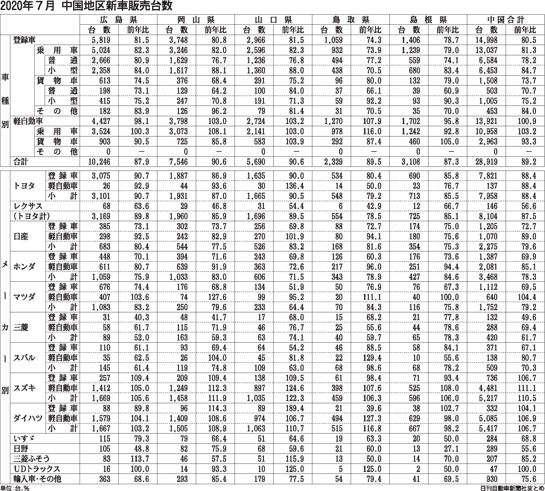 中国地区2020年7月の総新車販売台数は、前年同月比10・8%減の2万8919台となった。軽自動車が0・9%増の1万3921台とプラス転換を果たしたこともあり、落ち込み幅は前月に比べ9・5㌽縮小した。登録車は19・5%減の1万4998台と...