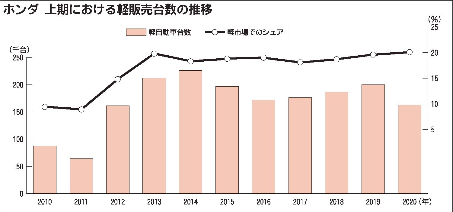 2020年上期(1~6月)の軽自動車販売台数に占めるメーカー別シェアで、ホンダが前年同期比0・5㌽増の20・1%と、過去10年間で最高を記録した。主力車種「N-BOX(エヌボックス)」の販売台数は10万1454台で、車名別販売台数の総合ラ...
