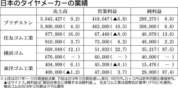 タイヤ4社17年12月期、原材料高騰で3社減益 SUV向けで商品拡充 今期は増益見込む