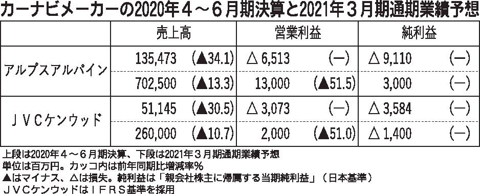カーナビメーカー2社の2020年4~6月期の連結決算は、アルプスアルパイン、JVCケンウッドともに最終損益が赤字だった。コロナ禍の影響で自動車メーカーの生産が滞り、需要減につながったことが響いた。両社とも4~6月を落ち込みの底とする見立て...