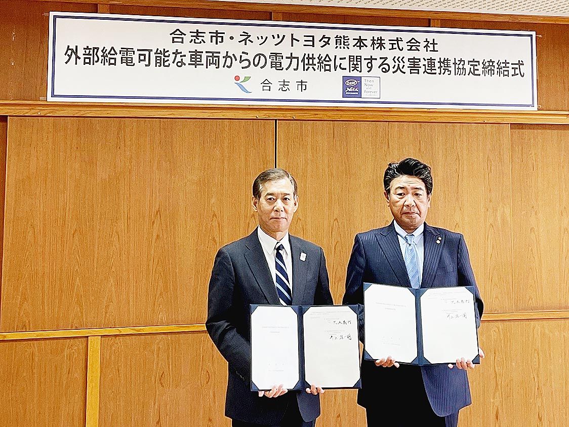 【熊本】ネッツトヨタ熊本(井上雄一朗社長)はこのほど、合志市(荒木義行市長)と「外部給電可能な車両からの電力供給に関する災害連携協定」を結んだ=写真。災害時に電力源としてプラグインハイブリッド車(PHV)「プリウスPHV」を貸し出し、避難...