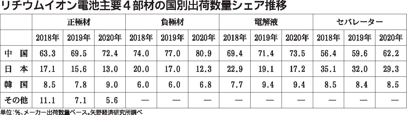 中国勢の勢いが増す―。矢野経済研究所が14日に公表したリチウムイオン電池の主要4部材(正極材・負極材・電解液・セパレーター)に関する世界市場調査の結果から、中国メーカーによる部材供給が拡大している実態が浮き彫りになった。4部材すべてで中国...