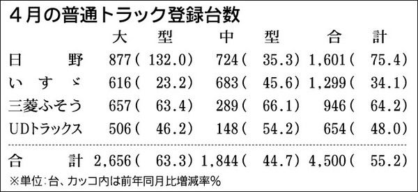 業界筋がまとめた2015年4月の普通トラック(積載量4トン以上)販売は、前年同月比55・2%増の4500台と大幅増になった。昨年4月が消費増税の反動減で低水準だったことが主因。2006年の排ガス規制強化時の特需による代替需要、公共工事の増...