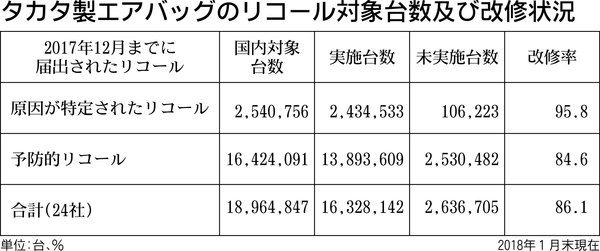 国土交通省は21日、タカタ製エアバッグインフレーター(膨張装置)の改修状況をまとめた。今年1月末時点での改修率は86・1%で、前月比で0・9ポイント上昇した。改修未実施車は約263万7千台あり、メーカー各社は引き続き、改修を急ぐ。...