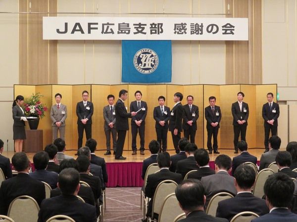 【広島】日本自動車連盟(JAF)広島支部(岡本精二支部長)は15日、ホテルグランヴィア広島(広島市南区)で会員獲得に貢献した昨年の優績者を表彰する「感謝の会」を開催した。ディーラー部門の個人総合1位にサービス部門1位でもあるダイハツ広島の...