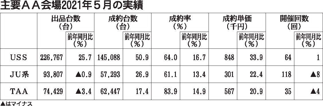 2021年5月の主要中古車オークション(AA)各社の実績が出そろった。前年の新型コロナウイルスによる影響の反動と中古車小売り需要の高まりなどで、各会場とも成約率は前年と比べて10㌽以上伸びた。出品台数はトヨタユーゼック(北口武志社長、千葉...