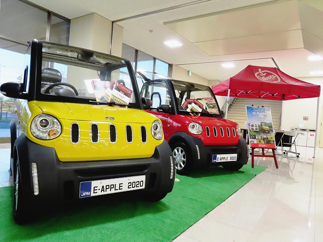 【岐阜】JU岐阜羽島オートオークション(熊崎尚樹社長)は同社オークション会場(羽島市)で超小型電気自動車(EV)「eーApple(イーアップル)」の展示試乗会を行った=写真。赤と黄色の展示車2台と試乗車1台をアップルインターナショナル(久...