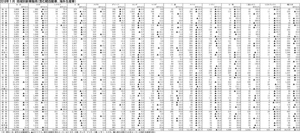 2018年1月の地域別新車販売は、20府県で前年実績を上回った。このうち沖縄は唯一、2桁増を記録したが、沖縄以外は5%以下の伸びにとどまった。全体は、前年同月比0・5%減の39万9655台で微減だった。 大市場では、東京(同3・2%減)、...