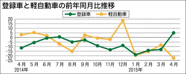消費増税から丸1年が過ぎた4月の国内新車販売台数は、登録車と軽自動車で大きく明暗を分けた。登録車が前年同月比5・0%増と9カ月ぶりに増加に転じたのとは対照的に、軽自動車は4カ月連続のマイナスで同20%を超える減少幅となった。消費増税に伴う...