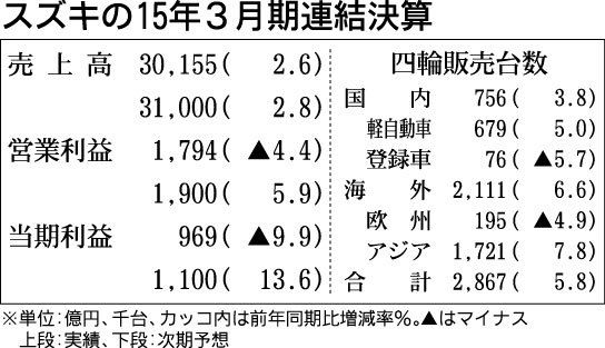 スズキが11日発表した2015年3月期連結決算は、国内の軽自動車販売で競争激化に伴う施策費用の増加したことに加え、製品保証関連費用が増加したこと、モデルミックスの悪化などがあり、営業利益が6期ぶりに減益となった。今期は、インドなど海外での...
