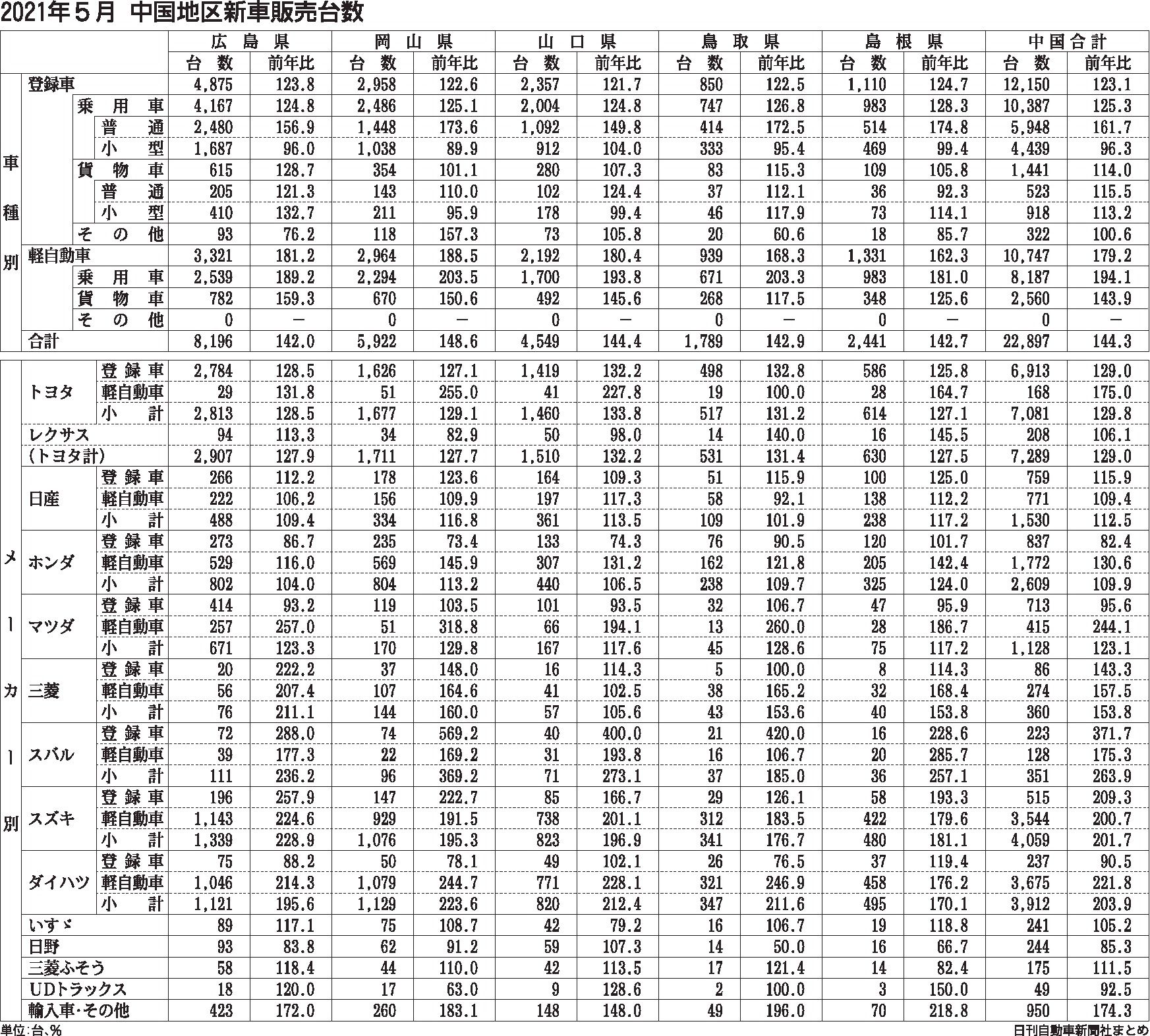 中国地区2021年5月の総新車販売台数は、前年同月比44・3%増の2万2897台で、3カ月連続で前年台数を上回った。伸長率は前月に対し16・7㌽増となった。登録車の台数は、前年同月比23・1%増の1万2150台で、伸長率の前月比は4・6㌽...