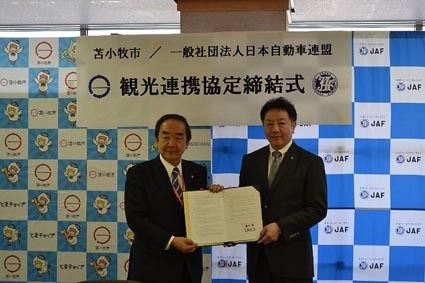 【苫小牧】日本自動車連盟(JAF)札幌支部(横井隆支部長)と苫小牧市(岩倉博文市長)は、観光連携協定の調印式を苫小牧市役所応接室で実施した。今後、JAFドライブ観光事業などにおける相互のタイアップを図る。 岩倉市長は「今回の観光連携協定締...