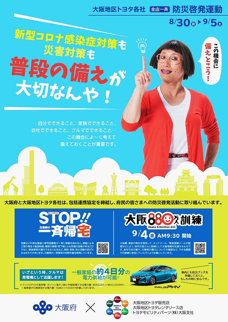 【大阪】大阪地区トヨタ各社が大阪府と連携した全店一斉防災啓発運動を展開している。大型防災訓練「大阪880万人訓練」開催日の4日に合わせて、8月30日~9月5日まで販売店やレンタリース店、トヨタモビリティパーツの各店舗で来店者への防災意識啓...