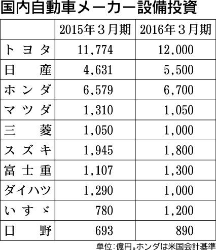 ■生産効率化や海外増強 国内自動車メーカーが好調な業績を背景に設備投資を拡大している。上場している国内自動車メーカー10社の2015年度の合計設備投資計画は前年度実績比5%増の3兆2440億円。生産効率化や海外の生産能力の増強に充当すること...