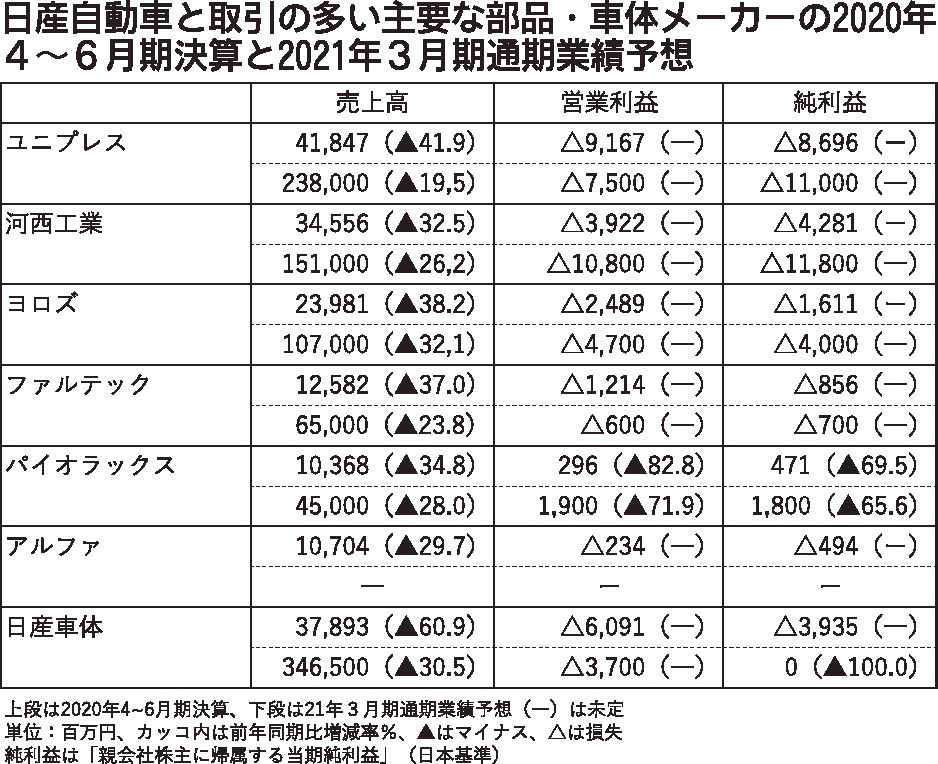 日産自動車と取引が多い部品・車体メーカー主要7社の苦境が鮮明になっている。2021年3月期通期の最終損益は、8月31日に第1四半期決算を発表したパイオラックスと未定のアルファらを除く4社が赤字を見込む。新型コロナウイルス感染拡大に伴う日産...