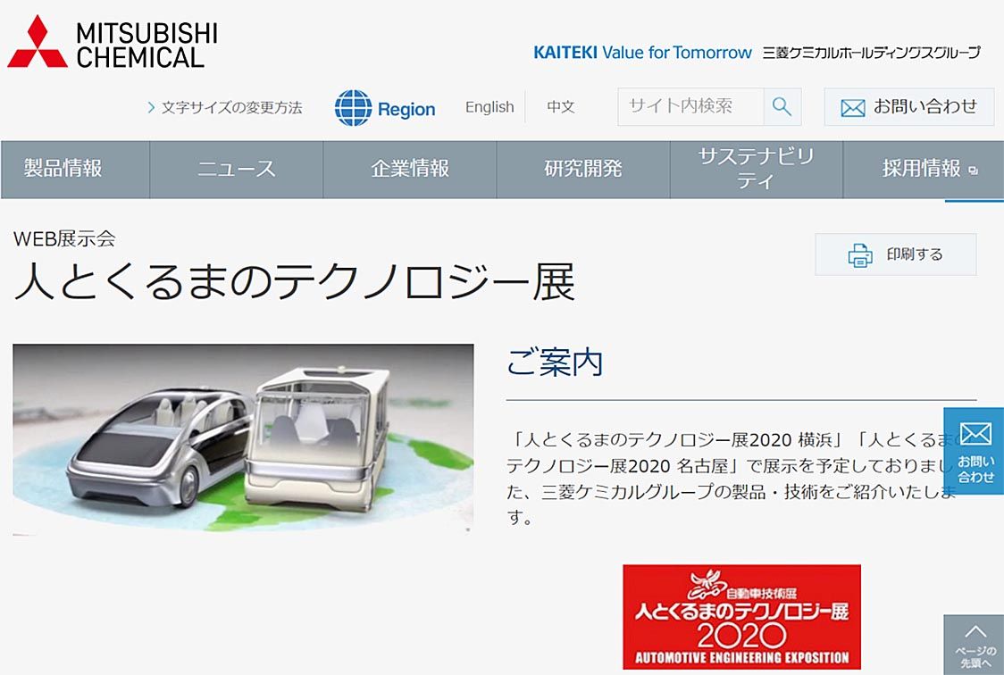 三菱ケミカルのホームページでは、自動車関連の新製品・技術・サービスを幅広く紹介する「WEB展示会」を開催中だ。近未来の2030年を見据えたコンセプトカー映像を作成し、次世代自動車の重要技術を6つのカテゴリーに分けて、グループの多様な製品群を紹介する。