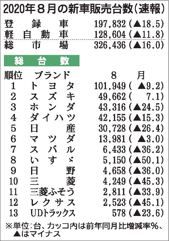 8月の登録車と軽自動車を合わせた新車販売台数は、前年同月比16.0%減の32万6436台だった。登録車が前の月よりもマイナス幅をやや縮めたものの、前年同月が高水準だった軽は落ち込み幅が拡大。新車市場の回復は足踏み状態だった。国産車メーカーのブランド別ではスズキが唯一の前年同月超を果たし、トヨタが5カ月ぶりに落ち込みを1桁に戻した。このほかのブランドは前月よりも落ち込みが悪化し、特に大型車メーカーは軒並み4月以降で最大のマイナス幅だった。