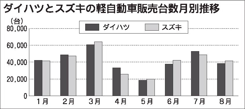 軽自動車のブランド別新車販売台数で、ダイハツ工業とスズキの首位争いが激しくなっている。2020年1~8月累計では、首位のダイハツをスズキが約1300台の僅差で追う状況だ。4月以降は、両社ともにコロナ禍で生産を一時停止するなど正常な市場環境...