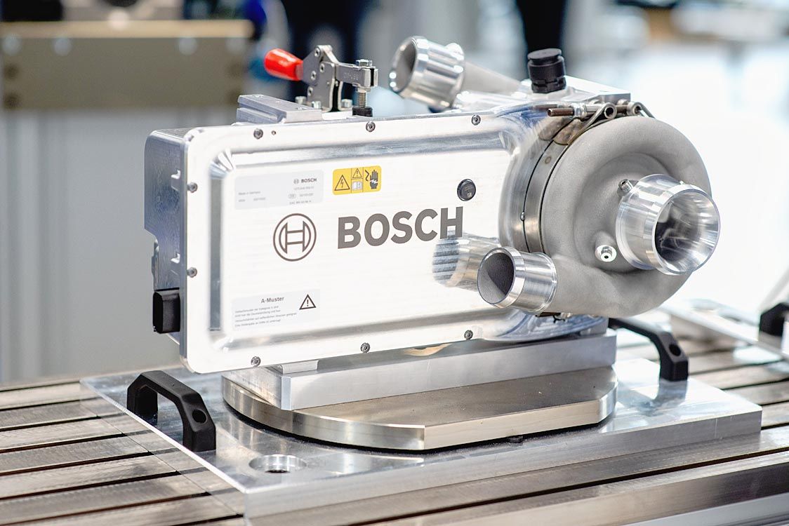 電動エアコンプレッサーはろ過された空気を燃料電池システムに供給する部品。ボッシュはシリコンカーバイド半導体を採用したパワーエレクトロニクス付き製品を提供する。高速電気モーターとパワーエレクトロニクスの組み合わせにより製造段階でのコスト競争力を高めるとともに、燃料電池システムとの統合を容易にした。