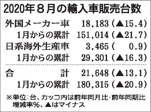 2020年8月の外国メーカー車新規登録台数、3ヵ月連続で回復 ベンツ、VWマイナス1桁 SUVが好調推移