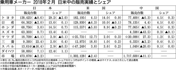 乗用車メーカー8社の2月の日米中販売台数は春節の影響により、中国の販売が日産自動車とマツダを除く5社で前年同月を下回った。昨年は1月末からだった春節の休暇が、今年は2月にずれ込んだ影響があった。一方、セダン市場の不振が続く米国では、ライト...