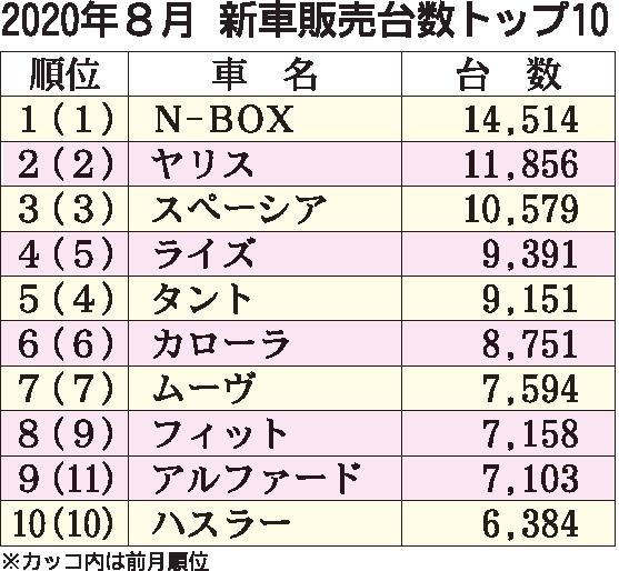 2020年8月の国内新車販売ランキング、N-BOX首位守る 2位はヤリス