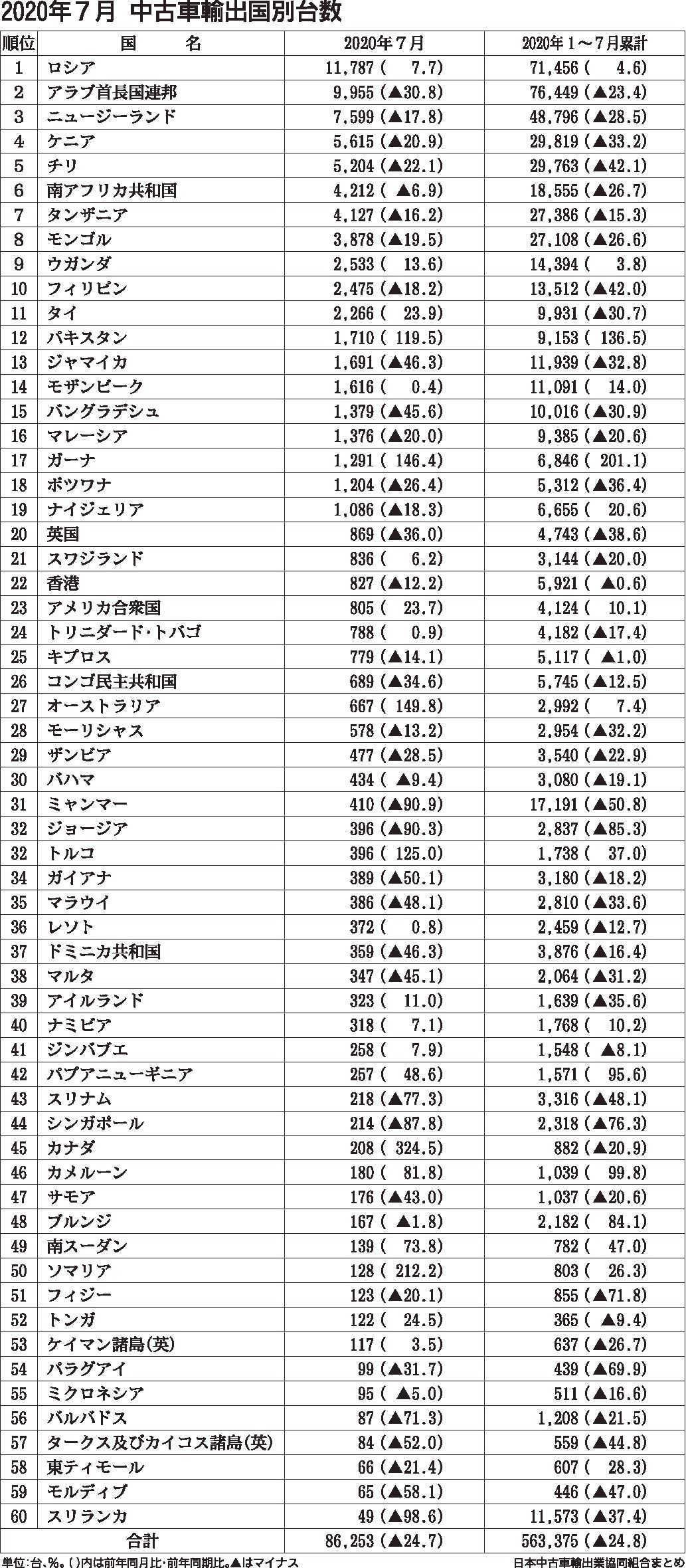 日本中古車輸出業協同組合(佐藤博理事長)がまとめた2020年7月の中古車輸出台数は、前年同月比24・7%減の8万6253台で5カ月連続のマイナスとなった。6月(同31・9%減)と比べてマイナス幅が7・2㌽減少したが、依然として低水準で推移...