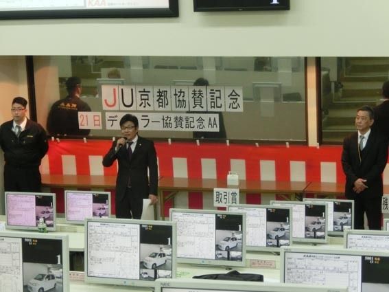 京都オートオークション(KAA、大峰高社長)は14日、「JU京都協賛記念オークション」を開いた。京都府中古自動車販売商工組合(JU京都、東將之理事長)の協力のもとで563台の出品があり、成約は283台、成約率は50・2%だった。 競り開始...