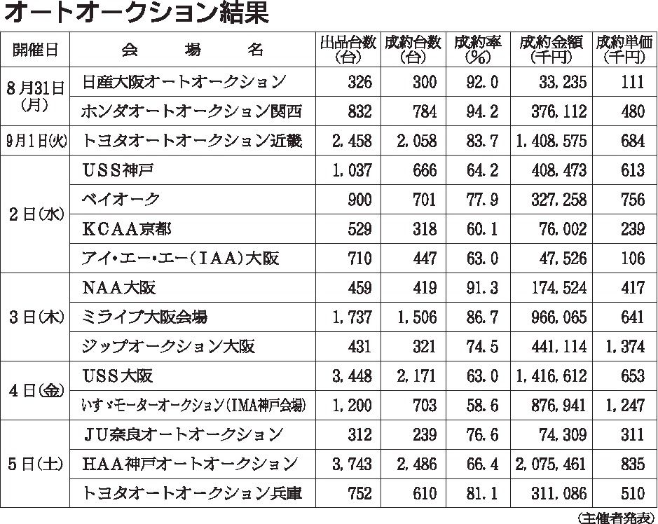 〈オートオークション結果〉近畿地区 2020/8/31~9/5