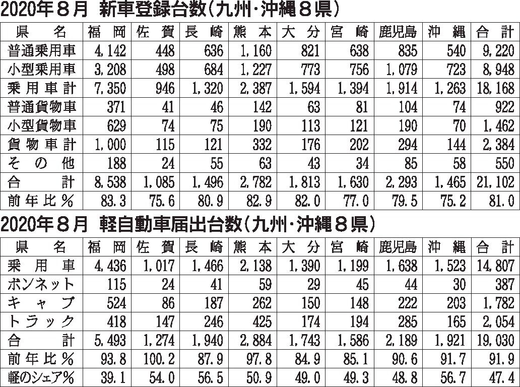 九州・沖縄地区の8月の新車販売台数は前年同月比14・2%減の4万132台となり、11カ月連続で前年実績を下回った。登録車は前月より減少幅が縮小したが、依然2桁のマイナス。前月は10カ月ぶりにプラス転換した軽自動車も微減ながら前年割れした。...