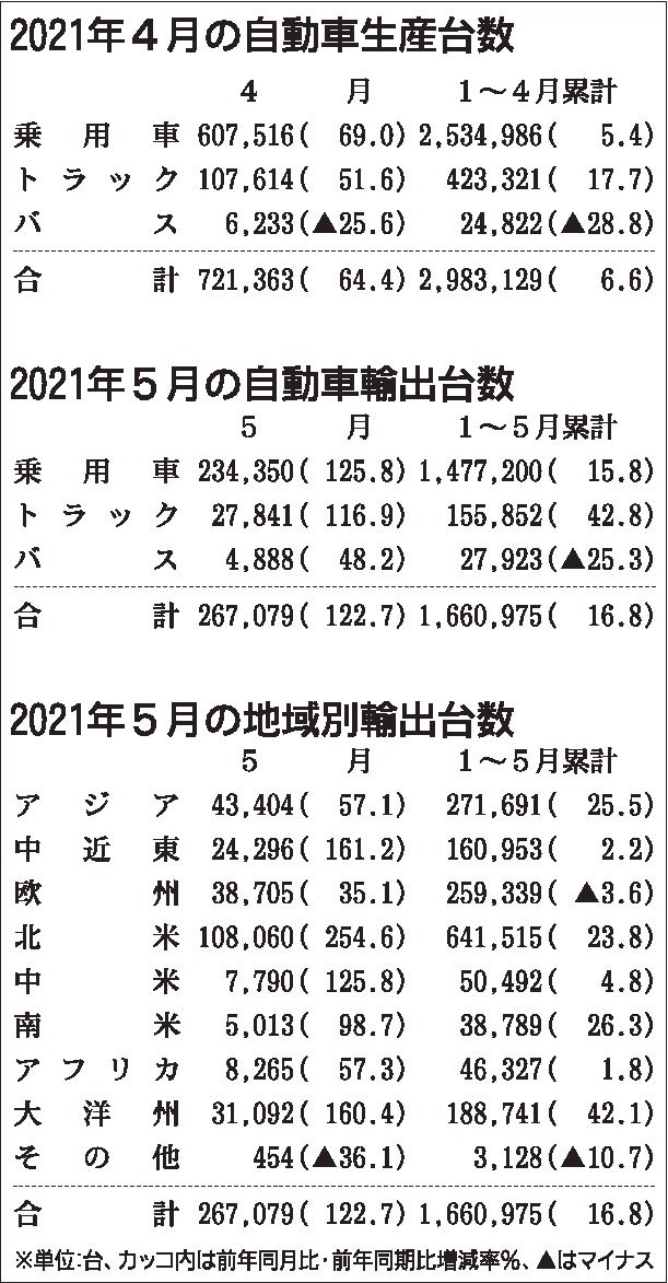 日本自動車工業会(自工会、豊田章男会長)がまとめた5月の四輪車輸出台数は、前年同月と比べて約2・2倍の増加となる26万7079台だった。コロナ禍の影響を大きく受けた前年と比べ、最大仕向け地である米国の需要が回復し、北米合計では前年同月の約...