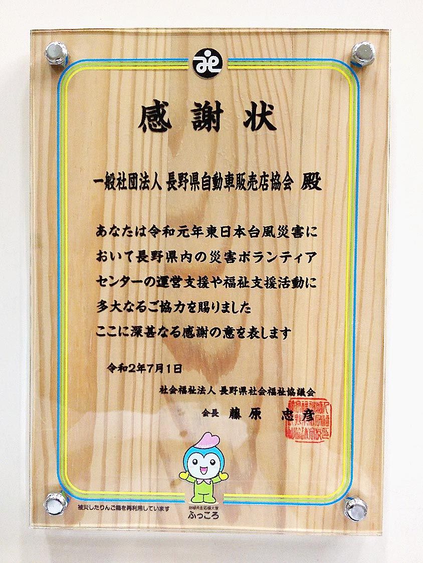 【長野】長野県自動車販売店協会(宇都宮進一理事長)は、昨年の台風19号災害で地元被災地に軽トラックを無償貸与、このほど長野県社会福祉協議会から感謝状が贈られた=写真。車両は2019年11月~20年3月が16台、4~9月には3台を貸与。主に...