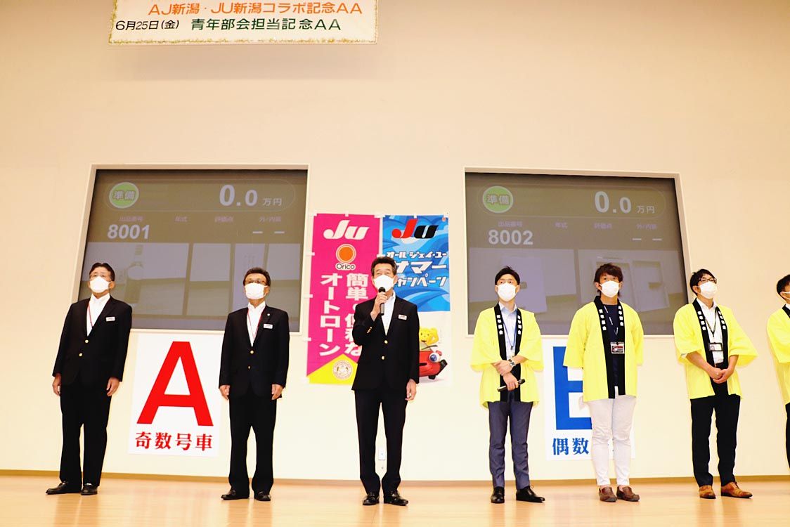 【新潟】JU新潟(海津博理事長)は、「令和3年度第1回JU関連協青年部会協賛 鍋谷新部会長就任・青年部会担当記念BIGオートオークション(AA)」を開催した=写真。2021年度1回目の青年部会担当AAとなり、今年度から新たに青年部会長に就...