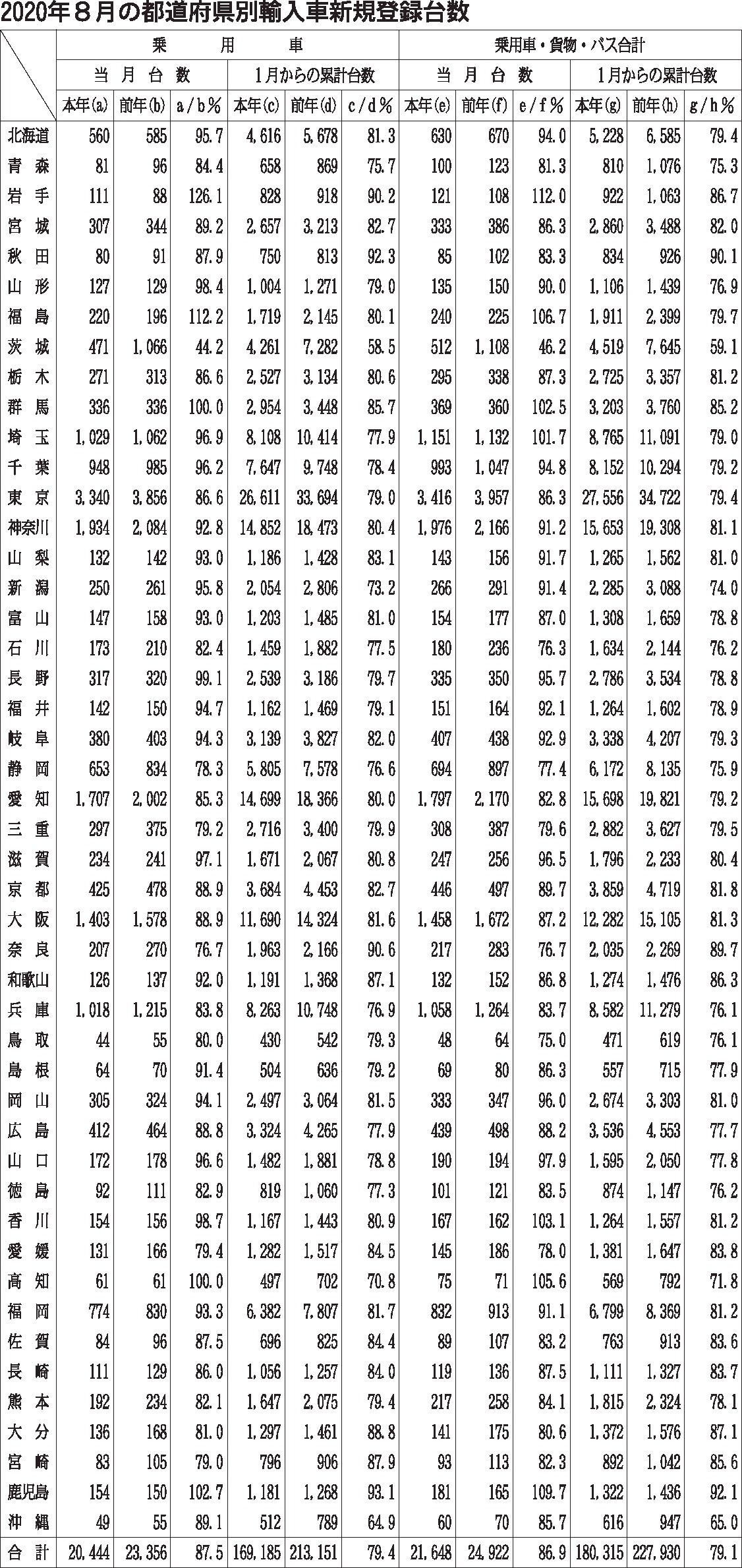 〈2020年8月の都道府県別輸入車新規登録台数〉