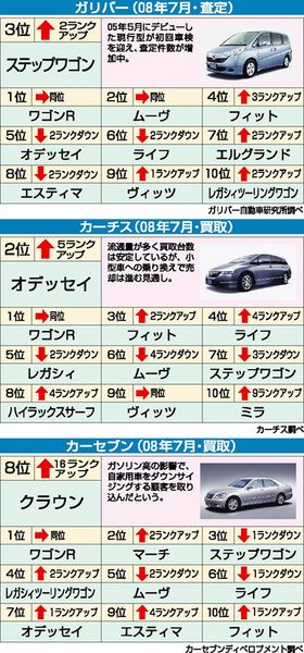 ガリバー自動車研究所、カーチス、カーセブンディベロプメントがまとめた2008年7月の中古車買取&査定ランキングでは、ガソリン価格の高騰を背景にしたミニバンの売却傾向が見て取れる。各社とも消費者のコンパクトカーシフトが進行していると見ており...