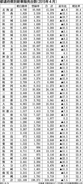 日刊自動車新聞は2015年4月の都道府県別新車販売台数および軽自動車比率をまとめた。販売台数は東京と鳥取、沖縄の3都県を除く44道府県で減少。軽比率が最も高かったのは長崎で57・1%だった。 4月の全国市場は前年同月比7・5%減。47都道...