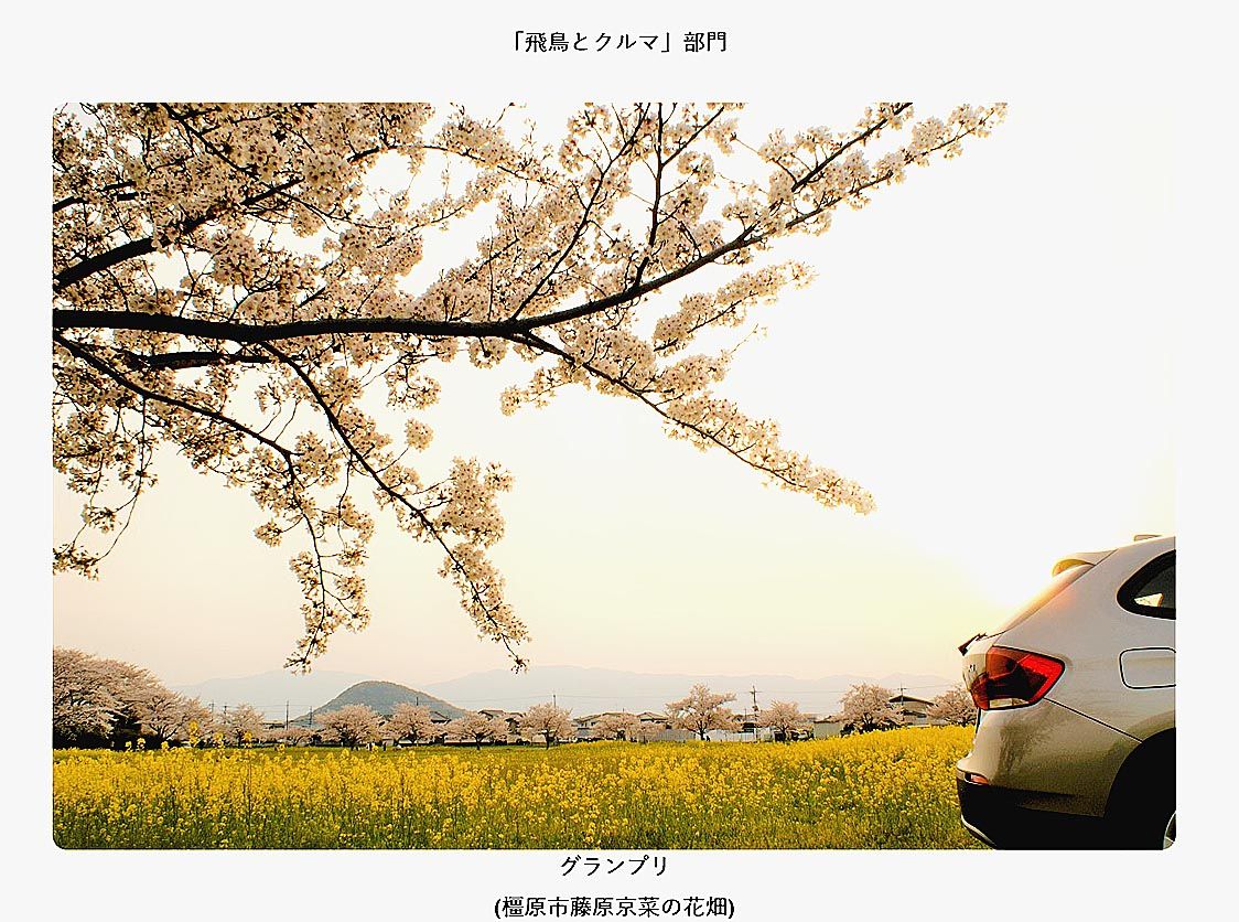奈良トヨタグループ(菊池攻社長)が実施した飛鳥ナンバー誕生記念のフォトコンテストで、「飛鳥とクルマ」部門のグランプリに「橿原市藤原京菜の花畑」という題名の作品=写真=が選ばれた。 田原本本社(田原本町)で開催した表彰式で、菊池社長は「応募...