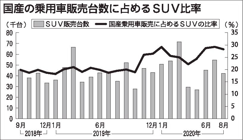 国産の乗用車販売台数でSUV比率が急上昇している。8月は前年同月比8・7㌽増の28・2%と大幅に伸びた。従来からSUV人気は高かったが、新型車効果とコロナ禍による生活様式やクルマ選びの変化が販売増を一層後押しした。8月31日にはトヨタ自動...